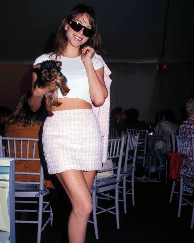 I mean can this image get more 90’s. A young Mariah Carey wearing a matching pink tweed Chanel suit. Iconic.