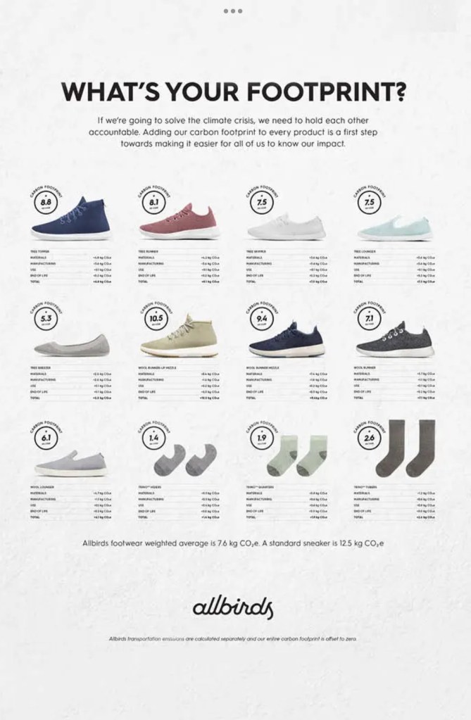 This is one of the main two reasons Allbirds is popular. The company is very aware of how shoe nd clothes making can be very harmful and impactful to the world. So thy try to solve this by using alternative materials to make the shoe, which reduce he carbon fottprint. Furthermore they are very transparent on how much emissions each of their product makes, which they display on the product so the customer knows. I think this is good for customers. With all the drastic climate events going on consumers are starting to be more conscious on how they shop and where they buy things. People are more willing to spend a little more as long as they know that it is helping the environment. .