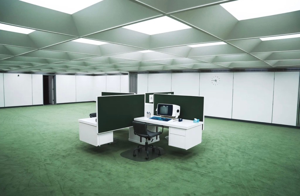 Like previously stated, the set design, in my opinion, are what really helped seal the deal with this show. The way the set was designed was in a way of having a lot of the office areas designed in a way that it looks like a liminal space.