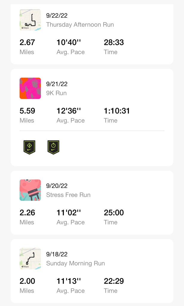 Having your stats available can help show you the improvement you have made so far. While there are various apps that can help you keep track of your running, I personally, love and use the Nike Run Club App. Since it can connect to your Apple Watch and other smartwatches when running it is very helpful in keeping track off various important stats like heart rate, mileage ran, time ran, etc.